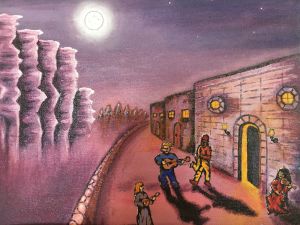 I’m not sure about the inspiration or source of this painting. It was likely painted for my parents and meant to represent or evoke memories of somewhere they travelled in Europe or South America. I don’t think any nationality or ethnicity is depicted here, but I could be wrong! I do know it is an early painting, possibly from around 1990. Steve had decided that he was really interested in painting, as opposed to drawing and it was around this time he took it up, teaching himself through trial and error. Steve was loathe to take formal schooling of any kind, music or art.