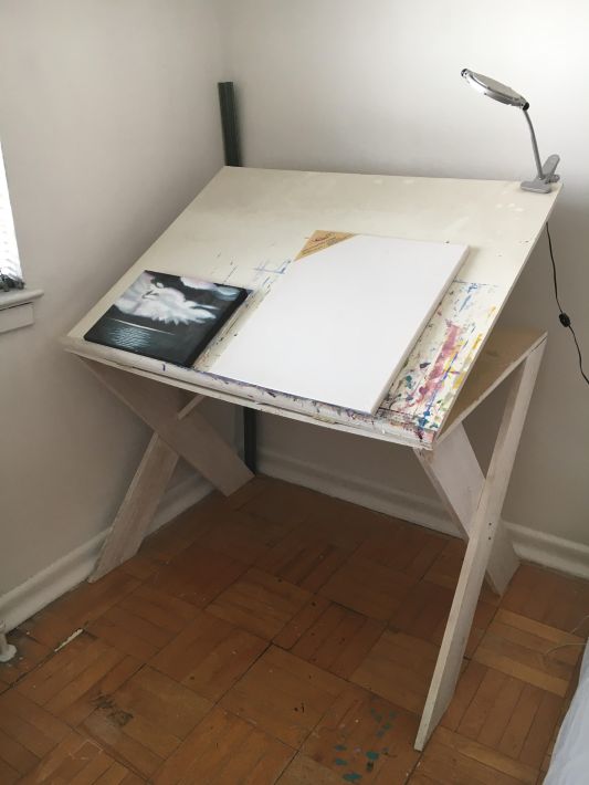 Above is Steve’s art table, where he did virtually all the work you can see on this website. You can see on the left of the table is something he had been working out possibly for a future piece (?) and an unopened canvas on the right beside it. There is debate as to whether our father, Pete, made this table for Steve or some 35 years ago for our brother, Peter, who was considering going into drafting/architecture. In any case, Steve ended up making good use of it.